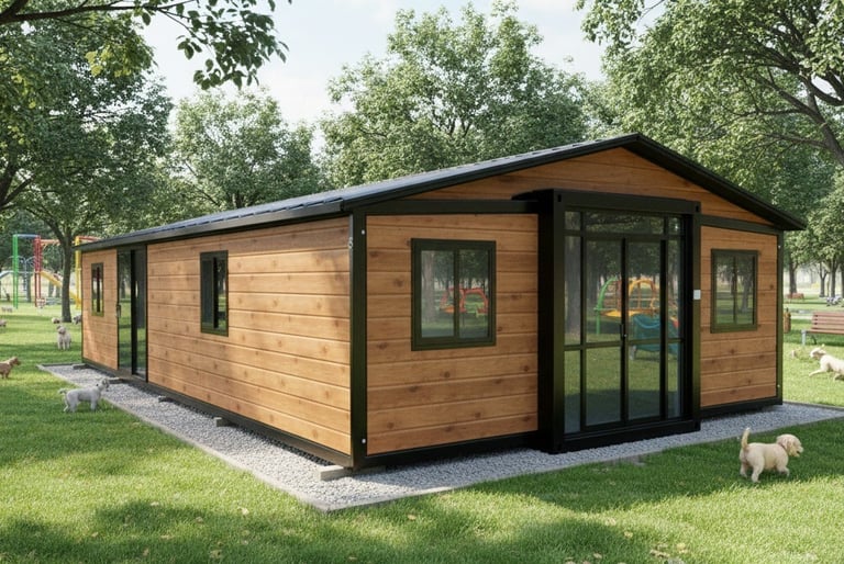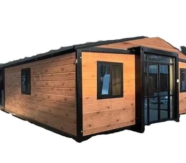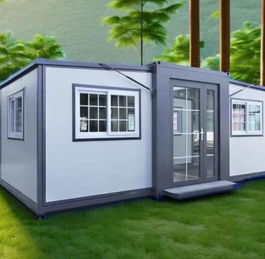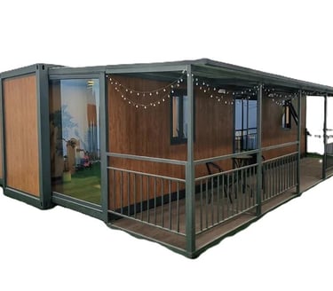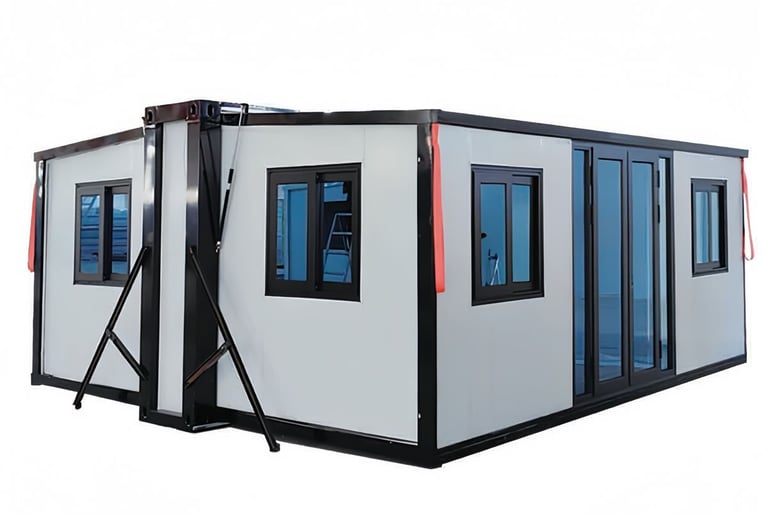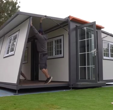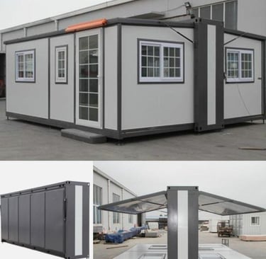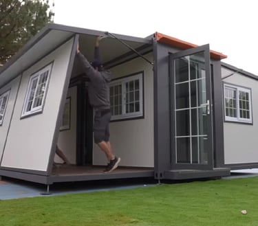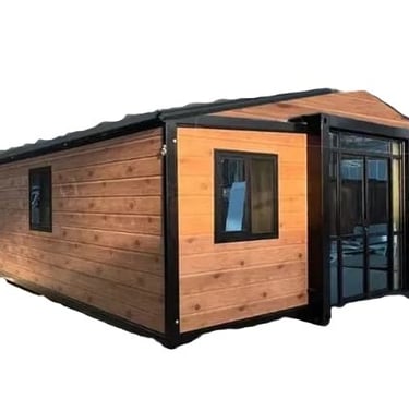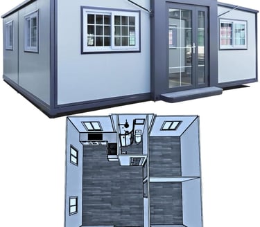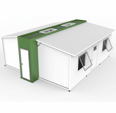 Incluye un módulo de baño preinstalado de 2,4 x 1,2m con ducha, división en vidrio, sanitario, mueble de baño con lavamanos y espejo.